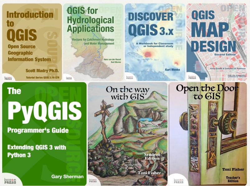 Locate Press also sells books (print and DRM-free e-book PDFs) that teach you about QGIS at your own pace (links at end of post). Introduction to QGIS is an entry-level introductory book. Discover QGIS 3.x looks at the latest features and dives even deeper. QGIS Map Design teaches specific cartographic techniques that GIS users will appreciate. On the Way with GIS and Open the Door to GIS use QGIS to provide a GIS education to students (including student and teacher guides). QGIS for Hydrological Applications, we mentioned above. And The PyQGIS Programmer’s Guide teaches developers how to write applications and plugins using Python. As you can see, these cover a widd range of users from cartographers to developers.